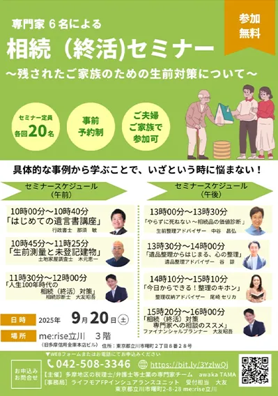 2025年9月20日(土)、me:rise立川 にて開催された「相続(終活)セミナー ~残されたご家族のための生前対策について~」において、当社代表 谷 涼氏が講師を務めました。